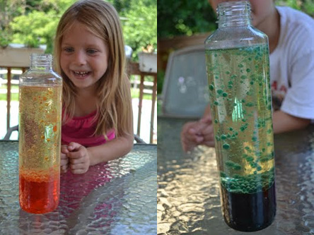 [box type=”success” align=”alignright” ]تتفاعل حبيبات الفوار مع الماء مكونة غاز ثانى اكسيد الكربون الذى يتصاعد حاملا معه فقاعات من الماء الملون عبر طبقة الزيت الكثيفة وعند تصاعد الغاز للهواء تنزل فقاعات الماء ثانية للأسفل.[/box]